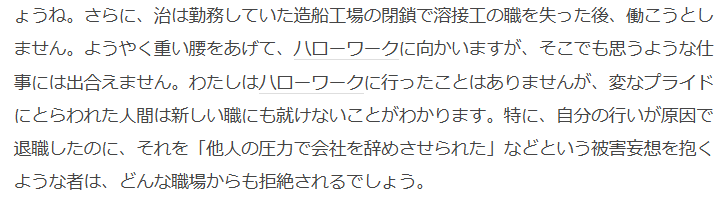 わたしはハローワークに行ったことはありませんが、変なプライドにとらわれた人間は新しい職にも就けないことがわかります。特に、自分の行いが原因で退職したのに、それを「他人の圧力で会社を辞めさせられた」などという被害妄想を抱くような者は、どんな職場からも拒絶されるでしょう。